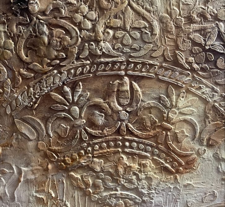Es un cuadro de fondo madera, texturado, pintado con anilinas diluidas en alcohol, sin pincel, ni espátulas, solo con movimientos.