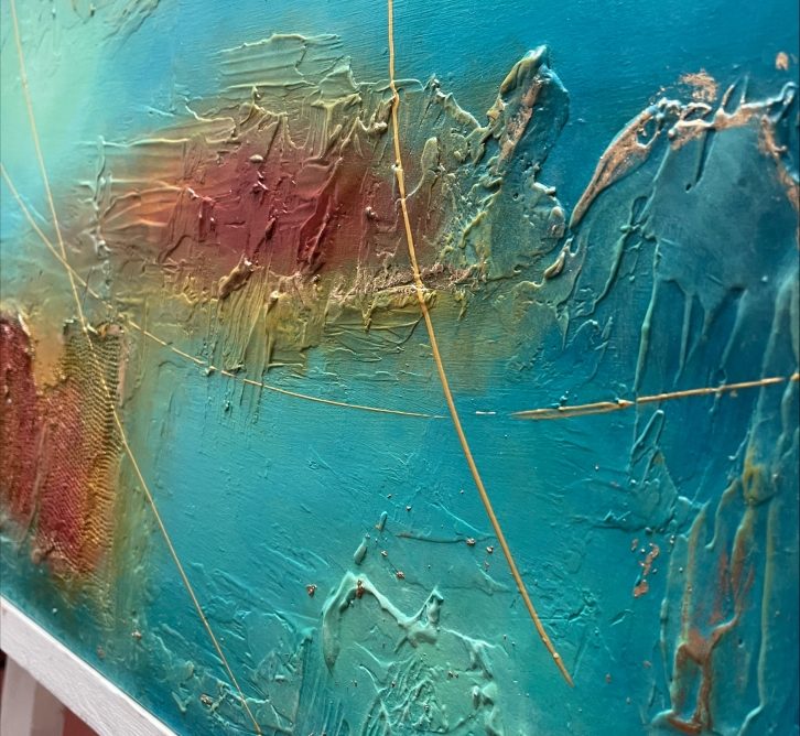 Esta obra dialoga entre lo fluido y lo terrestre, entre la calma profunda del agua (los turquesa), y la energía latente del fuego (colores rojo oxidado), explorando la tensión natural entre elementos opuestos pero complementarios.
