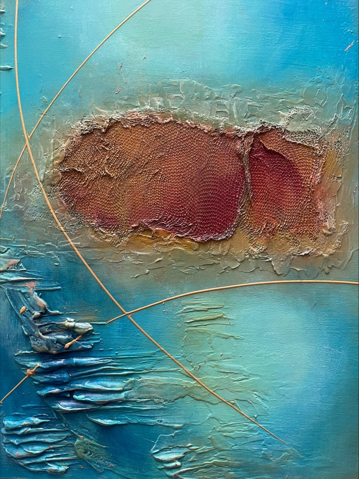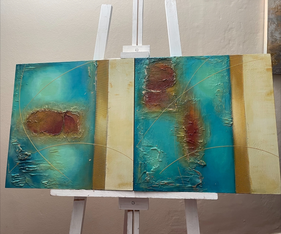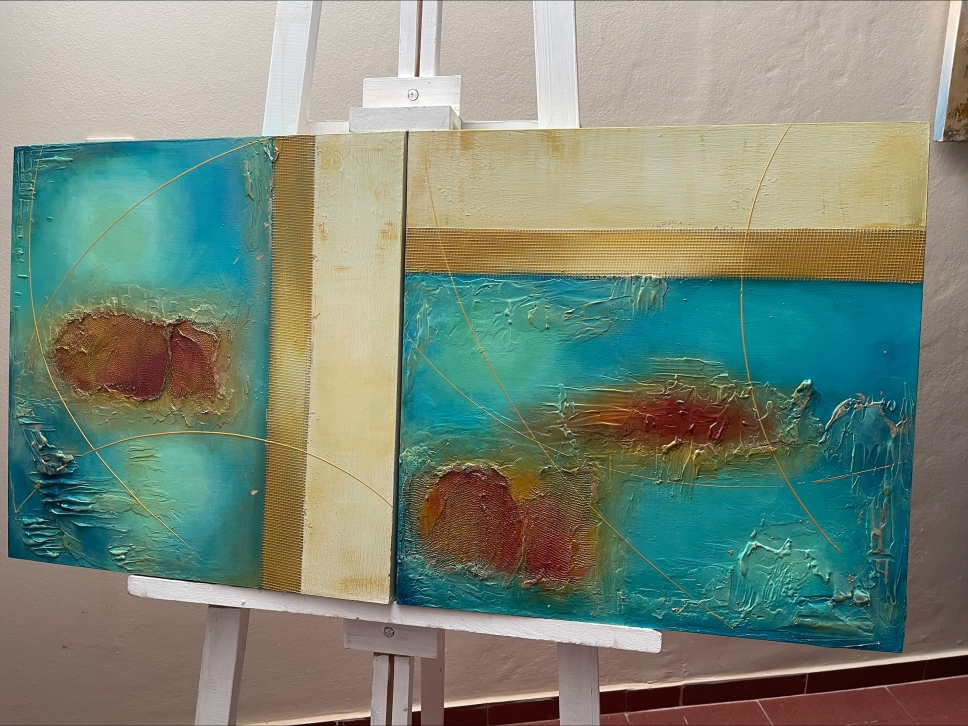 - Técnicas: se utilizó pastas de texturas, implementó de malla textil rugosa, acrílicos, pincel y espátulas. la división de ambos bastidores no separa, sino que integra, representando un umbral, un punto de transformación.